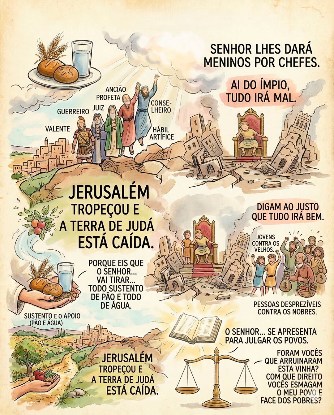 • O Apoio Social: A remoção das referências. Deus retira o guerreiro, o juiz, o profeta e o ancião (v. 2-3). Quando uma sociedade perde suas referências de maturidade e sabedoria, o caos se instala.